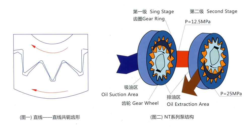 NT系列泵的工作原理同漸開(kāi)線內(nèi)嚙合齒輪泵一樣,由齒輪帶動(dòng)齒圈旋轉(zhuǎn),在旋轉(zhuǎn)過(guò)程中吸油腔容積由小變大產(chǎn)生真空而吸油,排油腔容積由大變小擠壓油液而排油。NT系列泵的最大優(yōu)點(diǎn)是采用直線共軛線的齒形(見(jiàn)圖一),并按無(wú)困油設(shè)計(jì),從而大大降低了泵的噪音和壓力脈動(dòng),工作時(shí)壓力油使滑動(dòng)元件得到強(qiáng)制潤(rùn)滑,磨損極少,提高了泵的使用壽命。